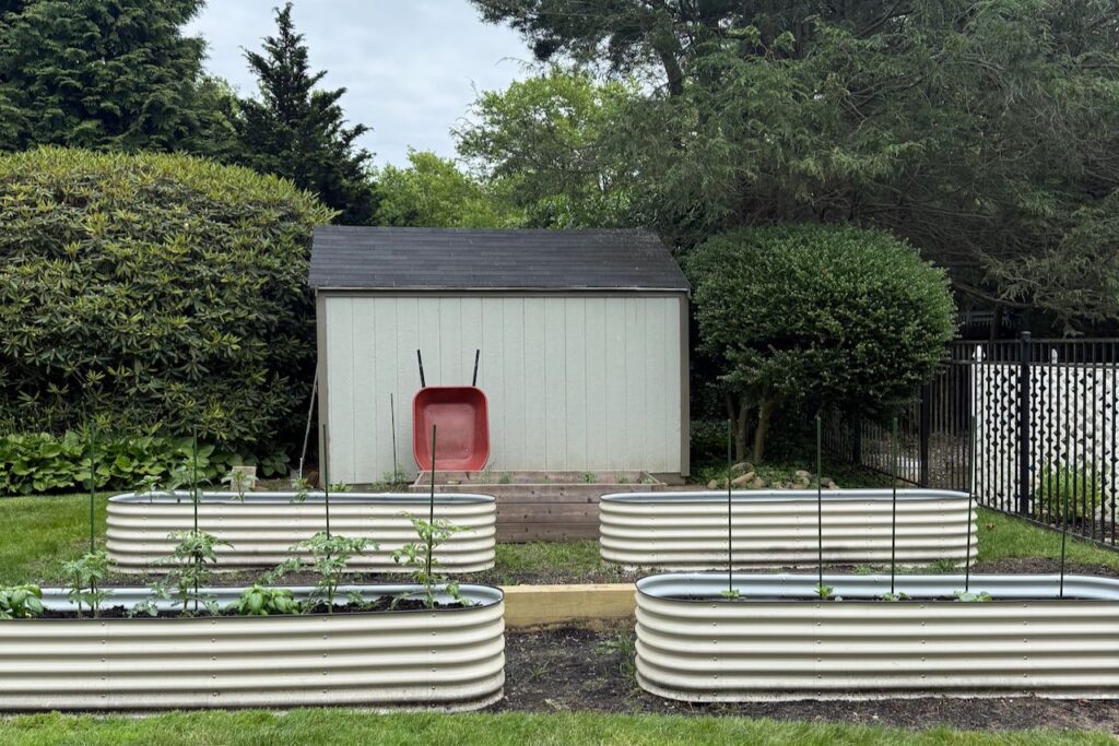 Once we had the wall built and the raised beds in place, it was time to get some water to our new little garden space. We had one raised bed in this area last year, so we were planning to just add on from the water we used then. Turns out, not so simple. Our original setup was fine for one bed, but not for five. So we needed help — again! This past week we finally got the water situation resolved and were able to fill the beds with soil and plant our seeds and seedlings.